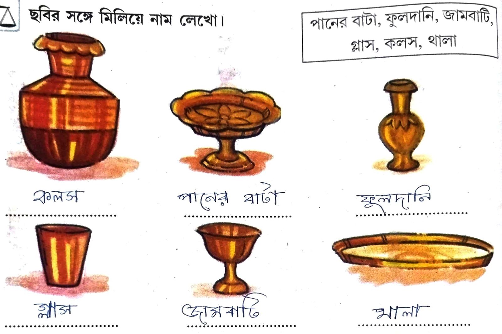 উত্তরঃ জামবাটি, ঘণ্টা, পিলসুজ, প্রদীপ, থালা, বাটি, গ্লাস, শরাই, গন্ডার,
