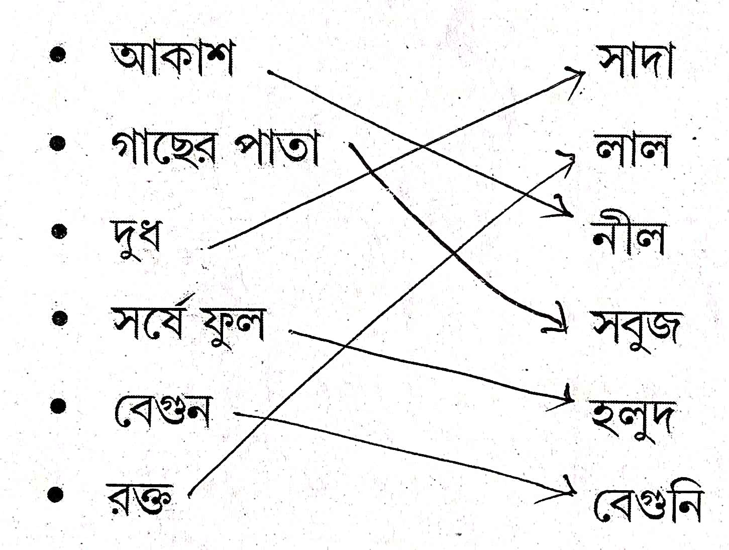 | দুধ | রক্ত | চুল | আকাশ | হলুদ | পাতা |